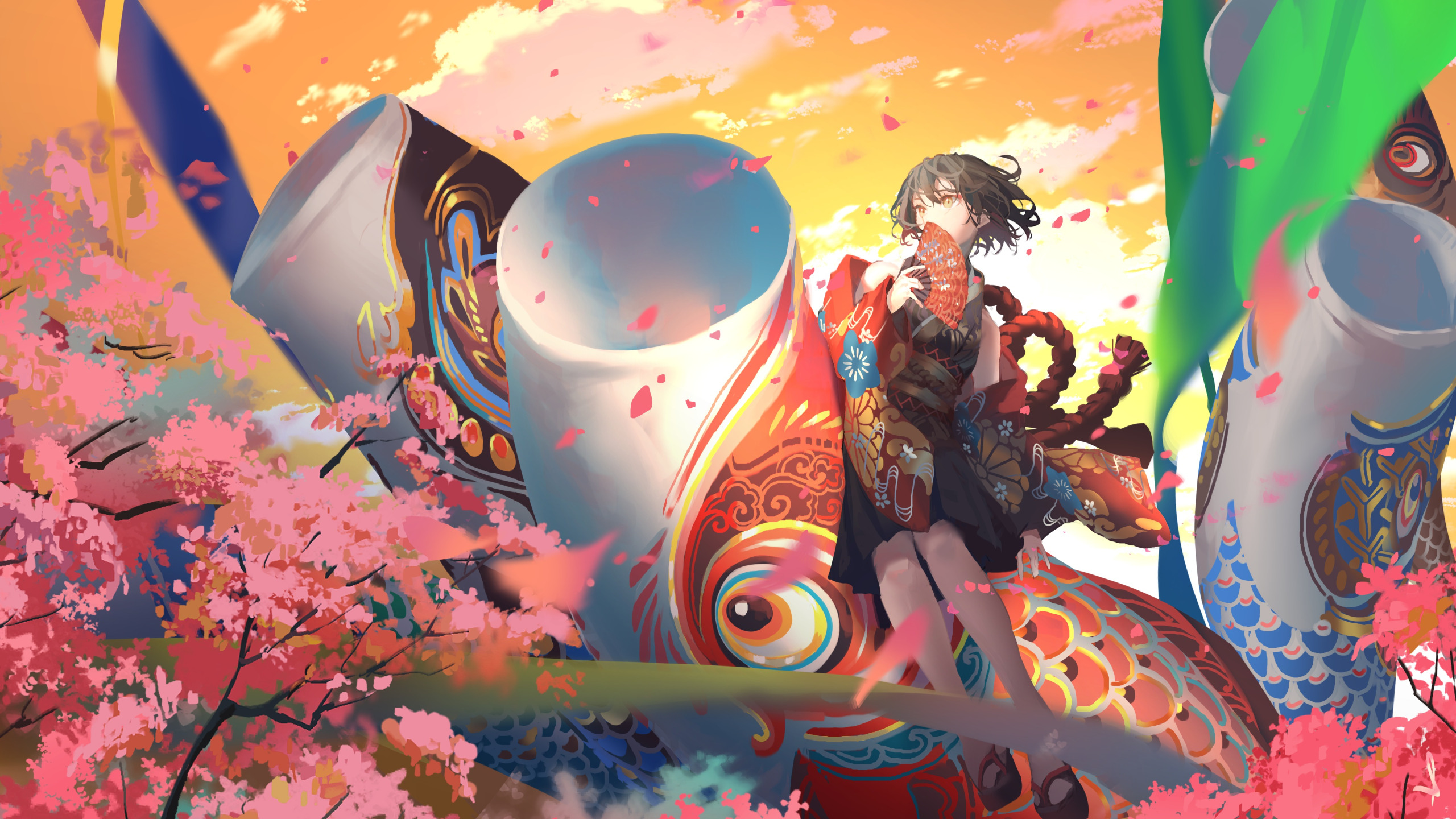 Back to Wallpaper girl, fish, Sakura, fan, kinobor