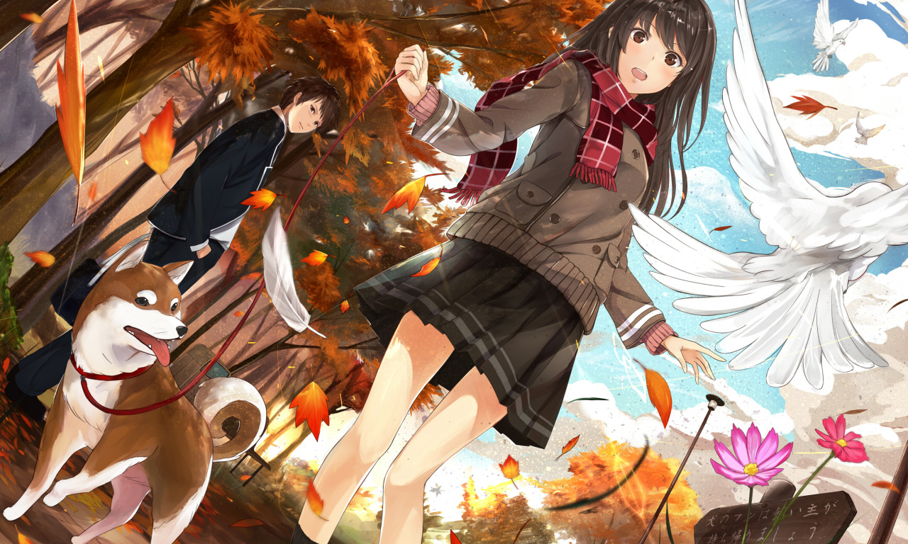 Back to Wallpaper girl, trees, flowers, smile, bird, dog, Kazabana Fuuka