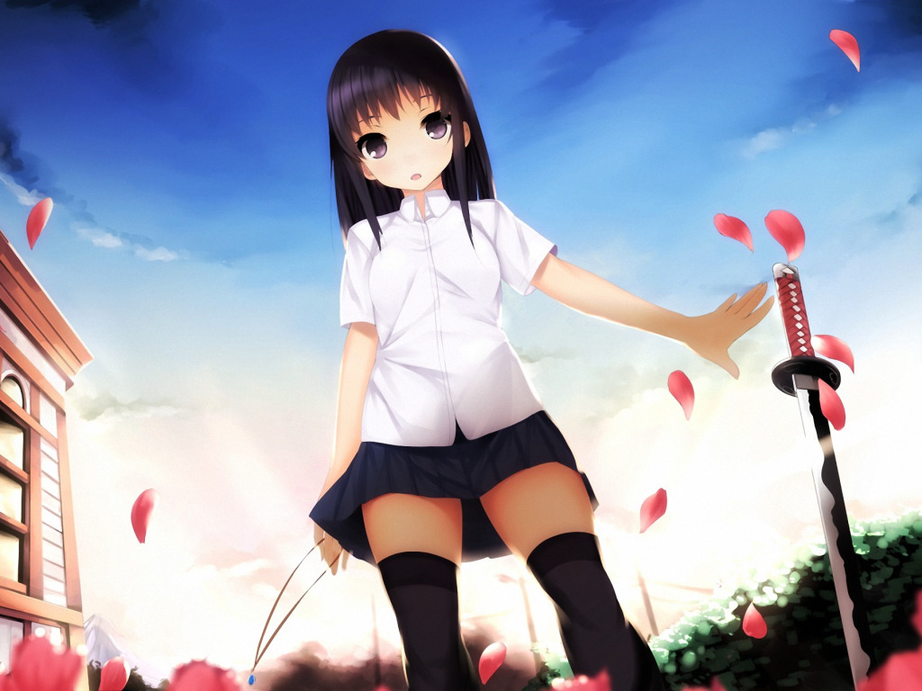 Back to Wallpaper girl, sword, katana, petals, art, pendant, chain, burakyan