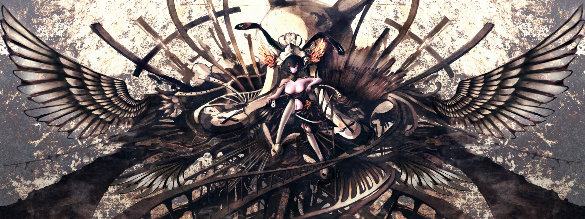 chest, girl, skull, wings, cross, anime, crown, art