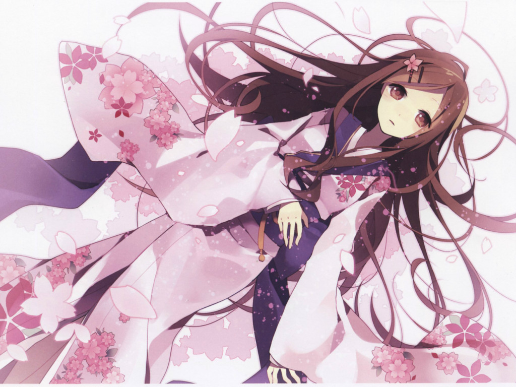 Back to Wallpaper girl, white background, kimono, long hair, cherry blossoms, lying on her back