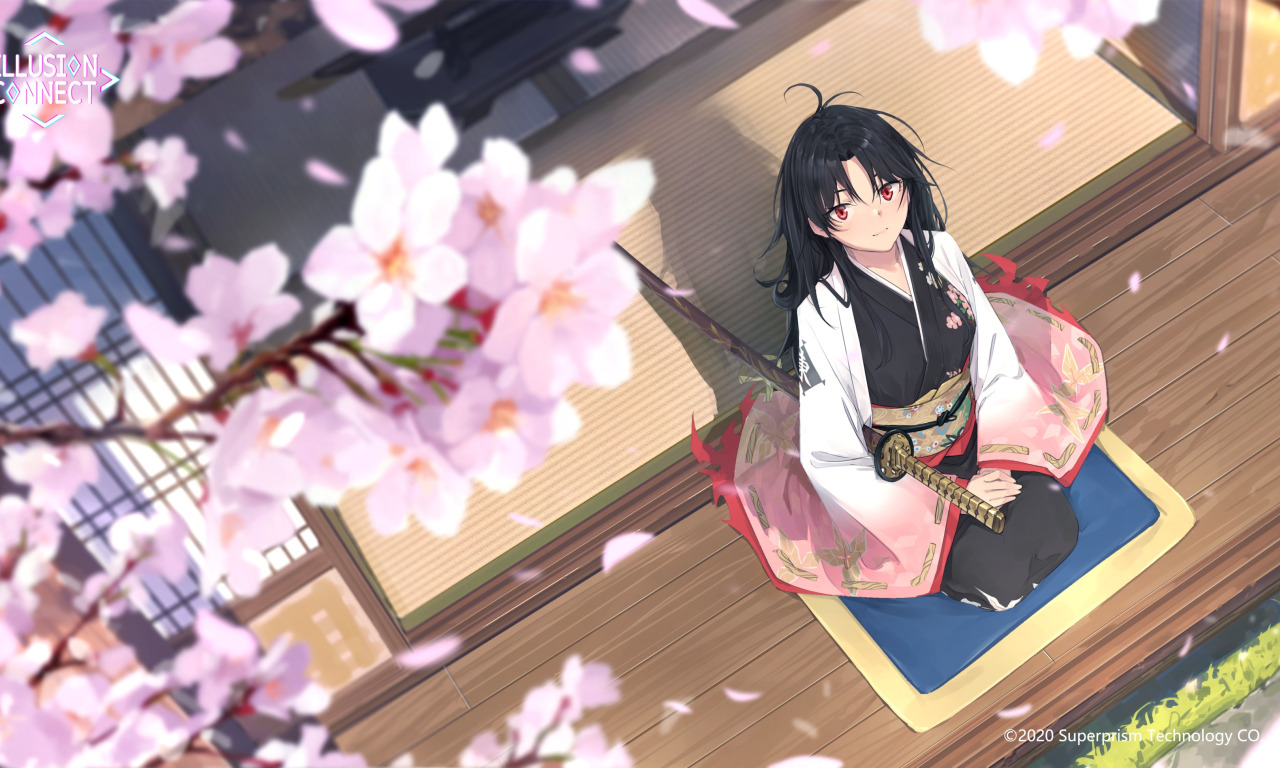 katana, Japanese clothing, Sunny day, veranda, looking up, cherry blossoms, tatami, sitting on my lap